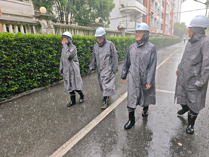 检查组一行先后巡查了奉浦校区校内施工工地、低洼易涝区域、教学楼、宿舍区、排水设施及校园绿化带等重点场所。在施工工地,校领导详细询问了防台措施落实情况,要求施工单位加强安全巡查,做好建材和设备防护,确保值守人员安全;在易积水区域,重点查看排水管网畅通情况,要求后勤部门及时清淤疏浚,防止内涝发生。