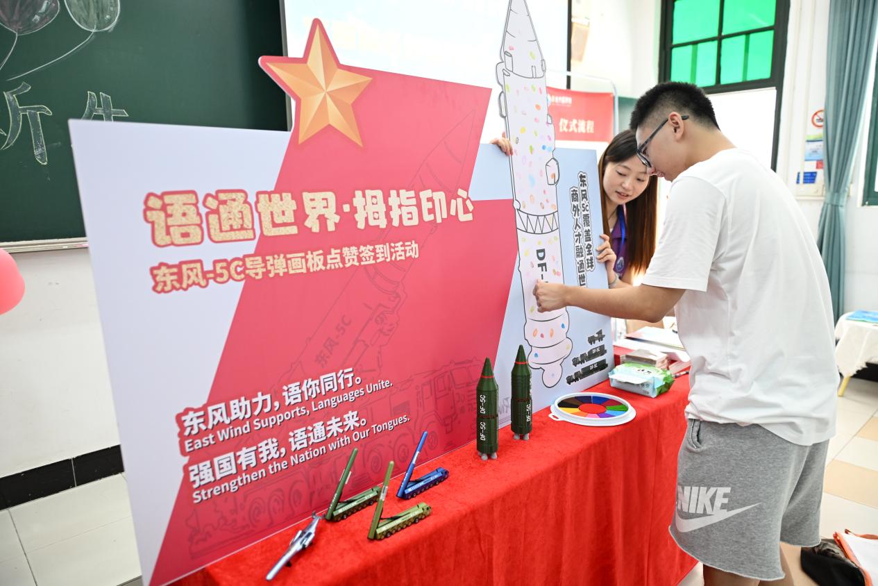 商务外语学院以“‘语’你同行,共赴‘心’程”为主题开展迎新活动。新生将红色细沙注入立体“心”形容器,象征与学院自此“心”意相通,未来将以“心”为帆、以语为桨,在上商沃土逐梦前行,收获星光。在“语通世界,拇指印心”画板签到活动中,新生留下拇指彩印,与东风-5C导弹硬核符号互动点赞,增强国防意识,响应“讲好中国故事”号召。此外,学院还组织入党申请书递交仪式,开展抗战胜利80周年大事件互动游戏,并赠送新生政治读本的外语译本,引导教育新生铭记历史、传承精神,深刻领会新时代青年的使命担当。