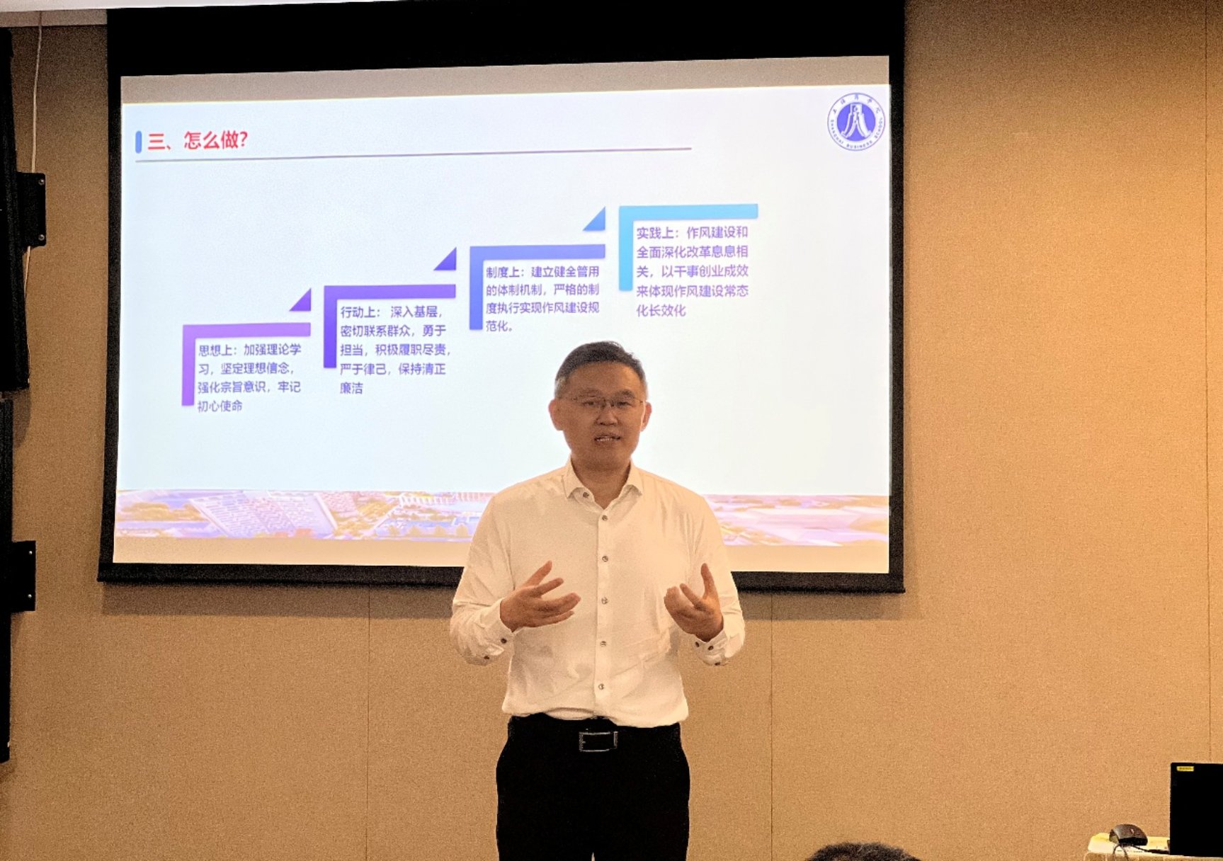 张绍华副校长以习近平总书记关于加强党的作风建设的重要论述为指引,从为什么、是什么、怎么做三个维度系统阐述了新时代背景下推进作风建设与数字商业创新发展的重要意义和实施路径。