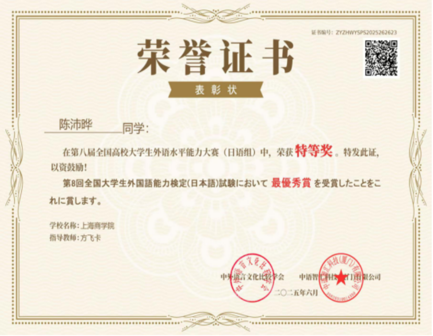 图为第八届全国高校大学生外语水平能力大赛获奖证书