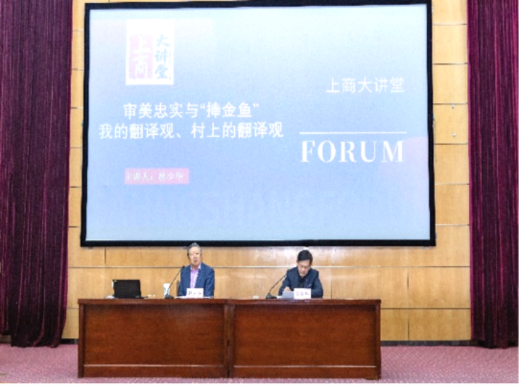 图为著名文学翻译家林少华做客上商大讲堂讲座现场