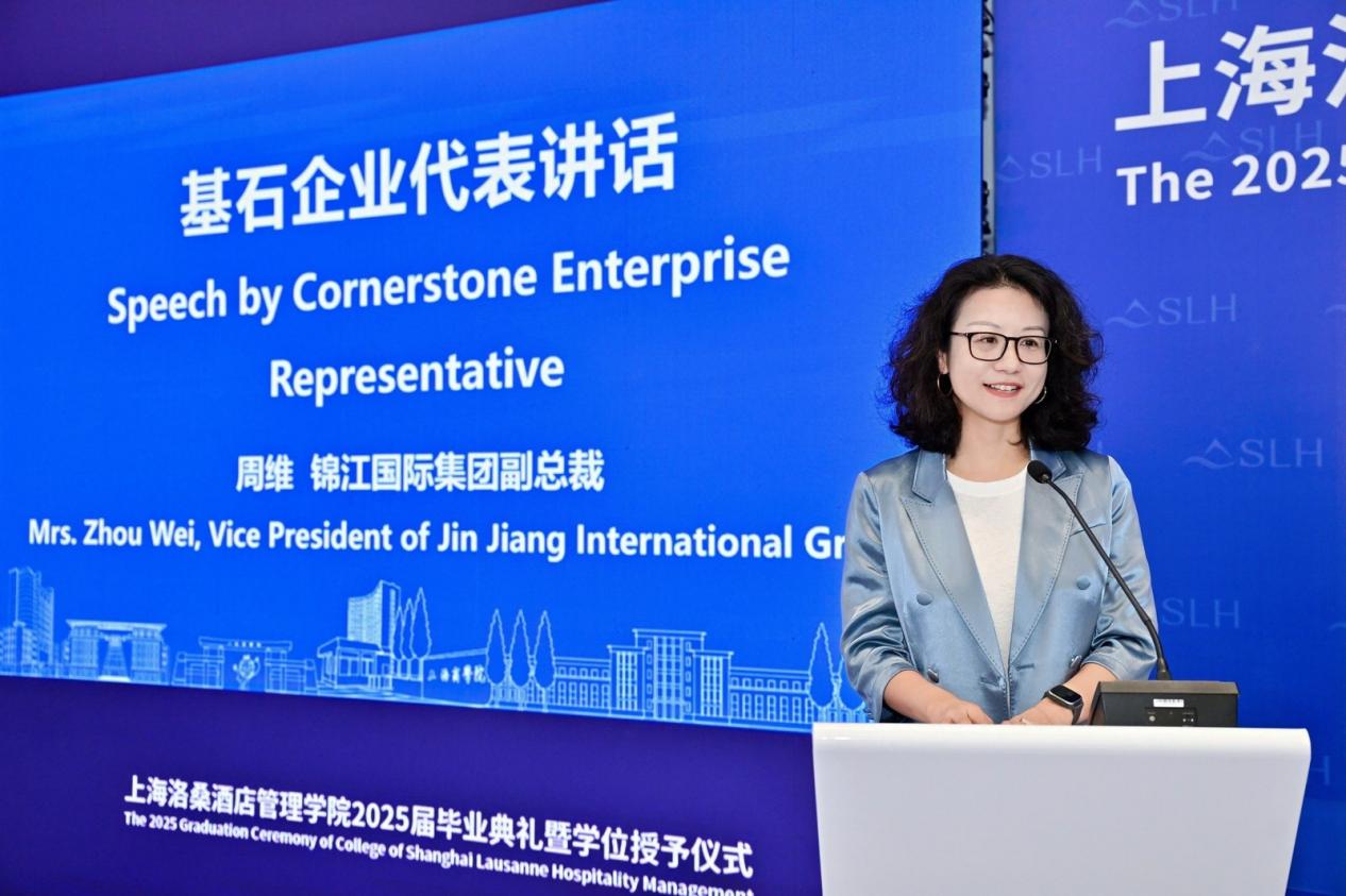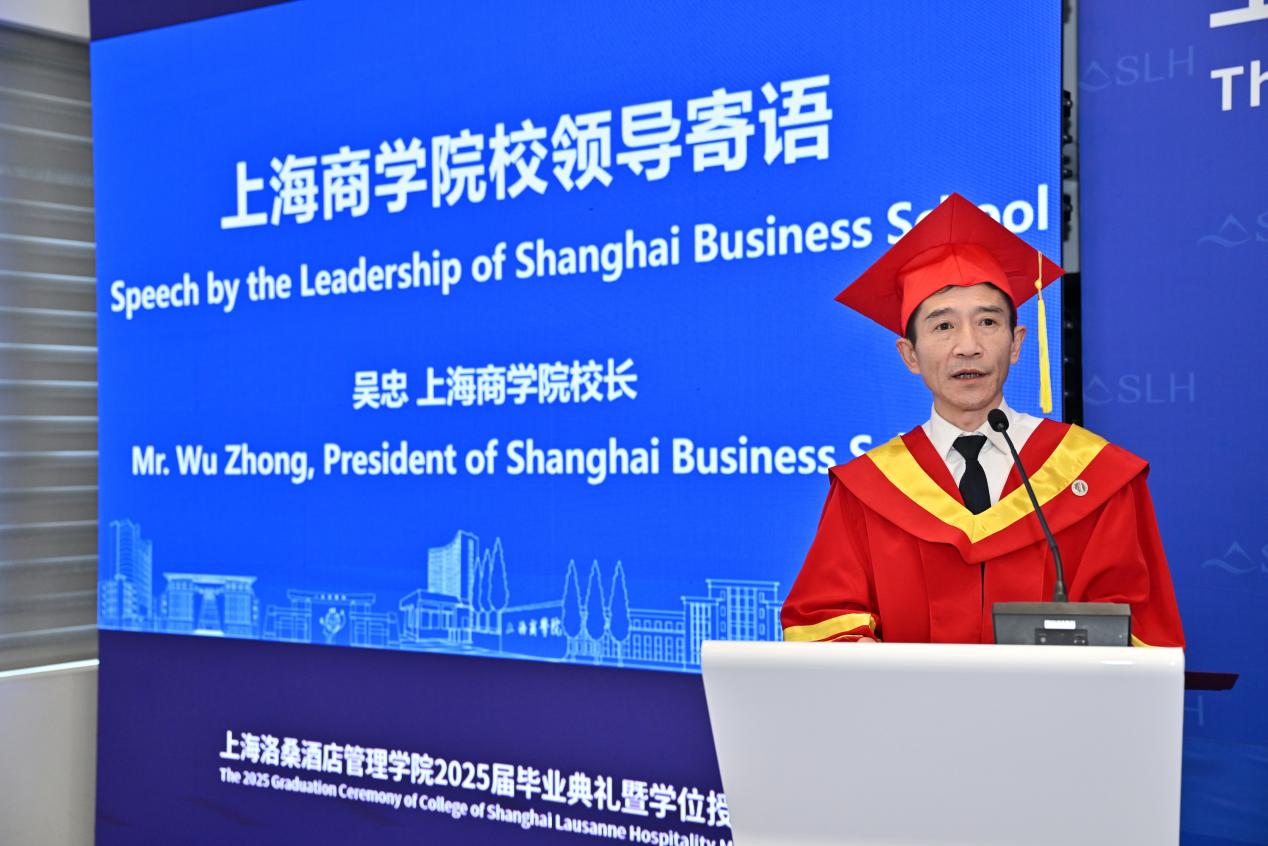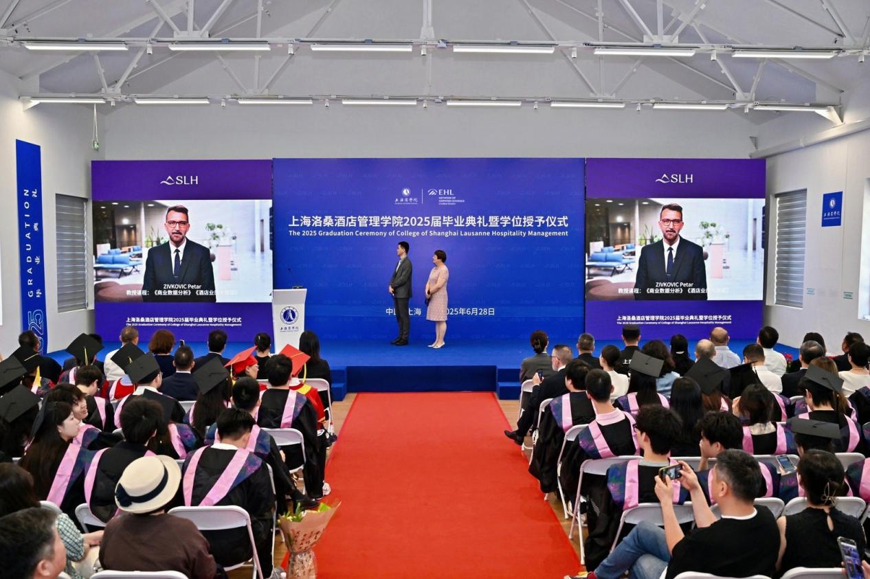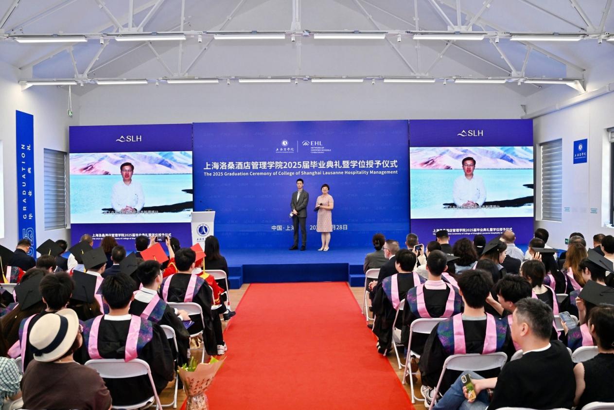 梧桐浓绿,栀子飘香。6月28日上午,上海商学院上海洛桑酒店管理学院2025届毕业典礼暨学位授予仪式于漕宝路校区隆重举行。作为中瑞深度合作办学的标杆项目,学院作为EHL认证院校联盟成员,承袭百年教育底蕴与上海商学院本土化办学优势,历经四年精心培育,迎来首批毕业生。EHL集团首席学术官胡安·F.佩雷隆,上海商学院校长吴忠,党委副书记、副校长劳晓芸、东湖集团副总经理彭立俊、锦江集团副总裁周维、携程集团副总裁王强以及各相关单位领导,教师代表、后勤服务职工代表,全体2025届毕业生及家长代表出席毕业典礼,共同见证2025届毕业生圆满完成学业,为他们即将开启的璀璨未来送上真挚祝福。典礼由学院执行院长胡笑寒、毕业生代表吴中岳主持。以“瑞辉同耀忆菁莪、瑞沪师韵铭心灯、瑞风韶华启新程”三篇章,勾勒出了首届学子从求学问道到逐梦远航的成长轨迹。