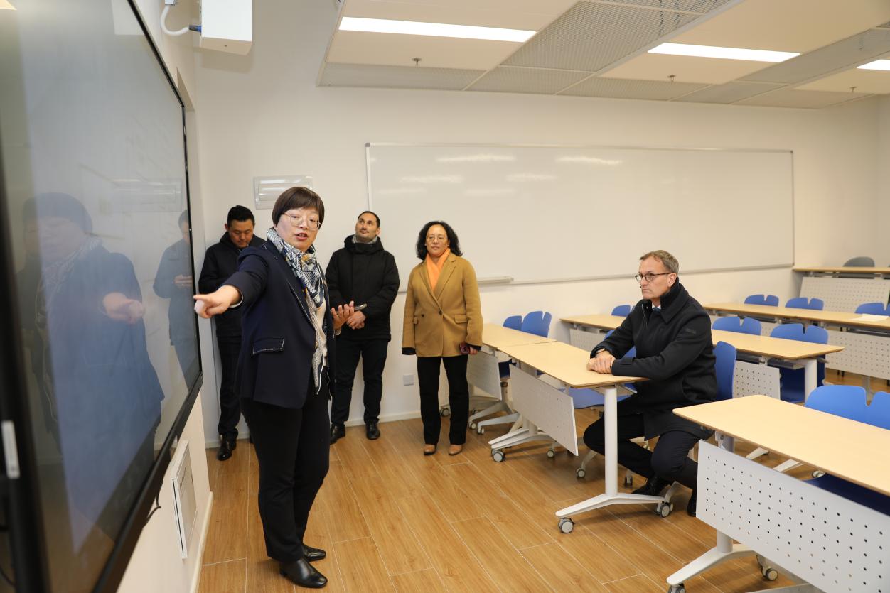 会前,劳晓芸率Markus Venzin一行实地参观了漕宝路校区各个教学及生活场所,并就咖啡、酒水及茶艺实训室、I-LAMP一站式综合管理平台、元宇宙体验中心、未来数智教学中心等场所进行了现场观摩。